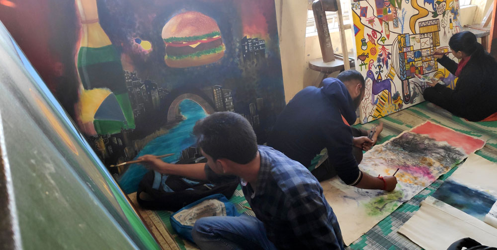 Department of PaintingThe department offers undergraduate degree programmes of B.V.A. The study includes handling of various medias like Pencil, Charcoal, Pen Ink, Conte, Chalk, Crayons, Oil, Acrylics, Gouache, Pastels, Tempera, Wash painting, Encaustic, Collage and Mural. Besides these, students also work in unconventional media, 3-D installations or new media like video art, performance etc. The students also study History of Painting, History of Indian & Western Art and Aesthetics. The objective of the specialisation course in painting is to offer the student with guidance in building skills required for creative visual expression. Painting is the visual expression of experience, thoughts and dreams, which stimulates one’s vision to new realities. The course would seek to cultivate in the student a unique personality and professional responsibility. The department has the flexibility that nurtures the potentiality of budding artists by providing them with ample scope of experimentation. The department is very actively engaged in exhibition, display, slide-show and work-shop, throughout the year. The faculty members are committed in creating skilled professionals who can flourish and make it big in the field of art. The young teachers and students are deeply bonded and are fully engrossed in their studies and execution of responsibilities.