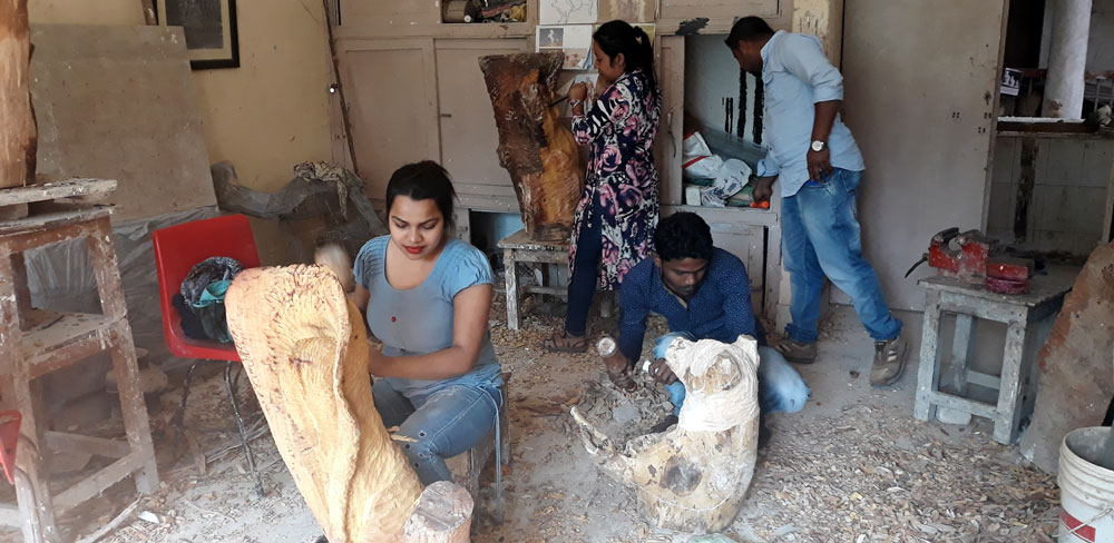 The department is engaged in producing potential sculptors under its degree programs. The study includes handling of various mediums like Clay, Plaster, Terracotta, Metal, Wood and Stone Carving, Scrap Metal and Modern Media etc. The students also study History of Sculpture, History of Indian & Western Art and Aesthetics. Moreover, they are encouraged to explore the expanding areas of sculpture including traditional and contemporary approaches, addressing form, space and time as well as new media. The department also provides with abundant opportunities for experimentation. Courses of studies in sculpture have been planned with emphasis on creative expression as well as practical/technical aspects of the students’ development. The faculty members take good care to groom their students more effectively by establishing close student - teacher contact.